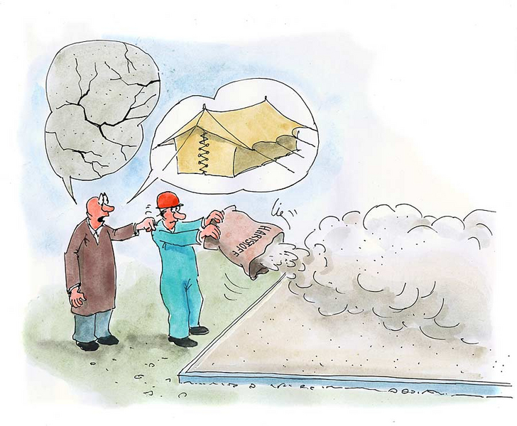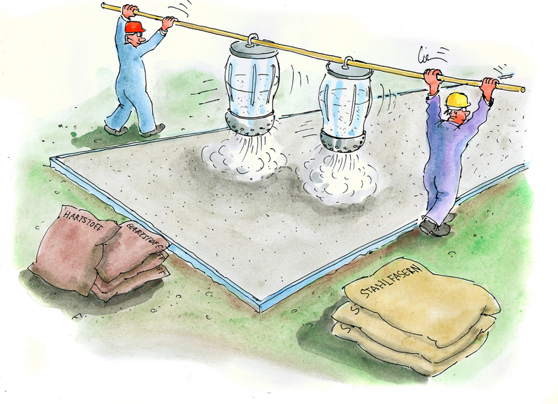 Die Einarbeitung von Hartstoffen in die Betonoberfläche härtet die obere Betondecke und macht sie somit noch verschleißfester. Die gleichmäßige Einstreuung der Hartstoffe erfolgt beim ersten Glätt-Arbeitsgang mithilfe eines Einstreuwagens. Das Material wird dann nach einer kurzen Reaktionszeit mit dem Glättteller in die noch frische Betonoberfläche eingerieben.